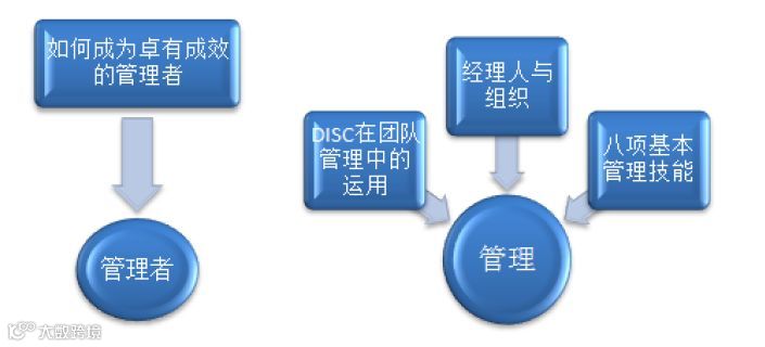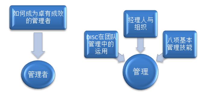 DISC 在团队管理中的运用谈到了如何识人用人,做到知人善任,用人所长。经理人与组织谈到了如何辅佐上司、着眼有效贡献、排除工作障碍、摆脱昨天包袱、承担决策风险和让组织为你工作。八项基本管理技能谈到如何利用八项管理技能来提高部门绩效。如何成为卓有成效的管理者谈到了管理者如何首先管理好自己,让自己成为一个优秀的管理者。