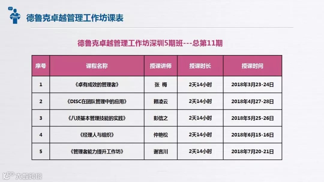 经过了四个课程的德鲁克管理培训,分别是:DISC 在团队管理中的运用、经理人与组织、八项基本管理技能和如何成为卓有成效的管理者。