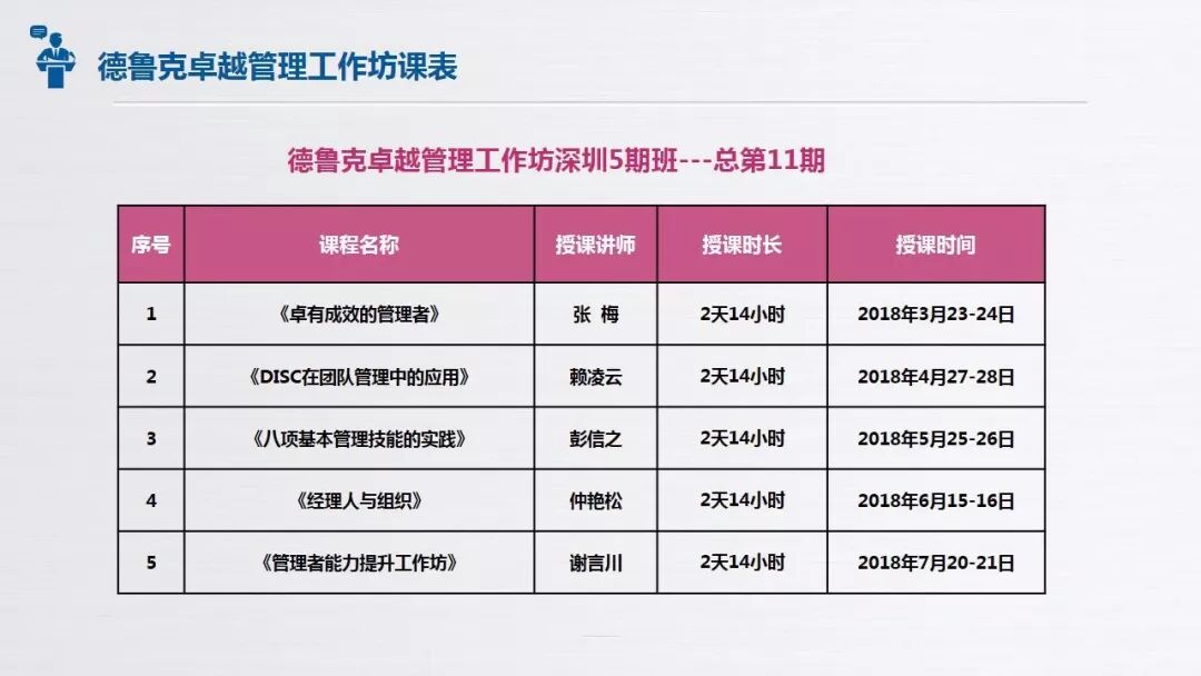 一转眼,毕业超过十几年了,我自己也从软件工程师,技术团队管理,项目经理,一直做到现在的整个研发管理,前后经历过4~5个公司,有非常成熟稳定的团队,也有初创型团队,在工作经历中,越来越明白管理的重要性,参加此次德鲁克管理培训后,感觉自己确实学到了很多知识和技巧方法,相对于之前学习的PMP项目管理,德鲁克的管理知识更全面,更实用,而且课堂的几位老师的授课方式也都非常出色,各有特色,不枯燥乏味,有讨论、有互动、有模范实例,一步步引导大家思考和逐步掌握管理技能。