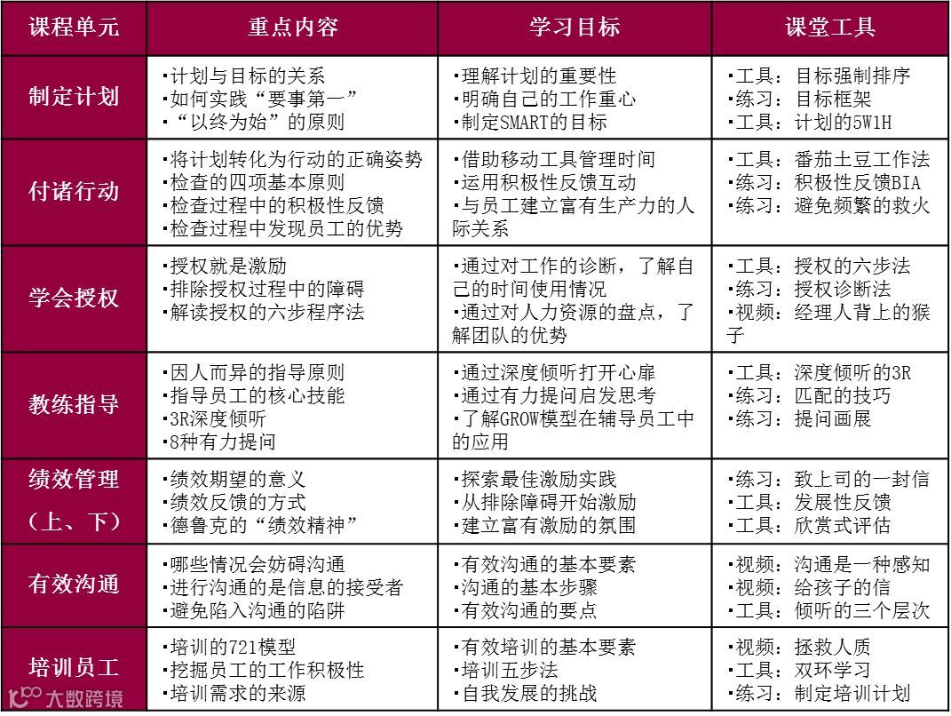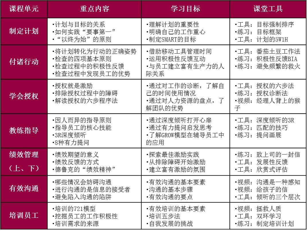 教学内容与德鲁克管理思想融会贯通,采用互动、演练、启发式教学,课堂70%的时间用于课堂教学活动的体验,全方位地覆盖了基层经理需要具备的管理技能,引导新经理在系统提升能力的过程中完成角色的转变。