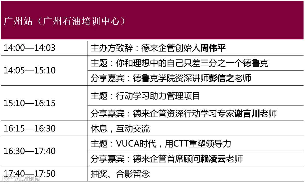 11月起,德来企管启动纪念德鲁克系列活动,11月19日深圳站圆满举办;12月17日,广州站,让我们继续以学习的名义——德鲁克卓越管理工作坊论坛纪念德鲁克。
