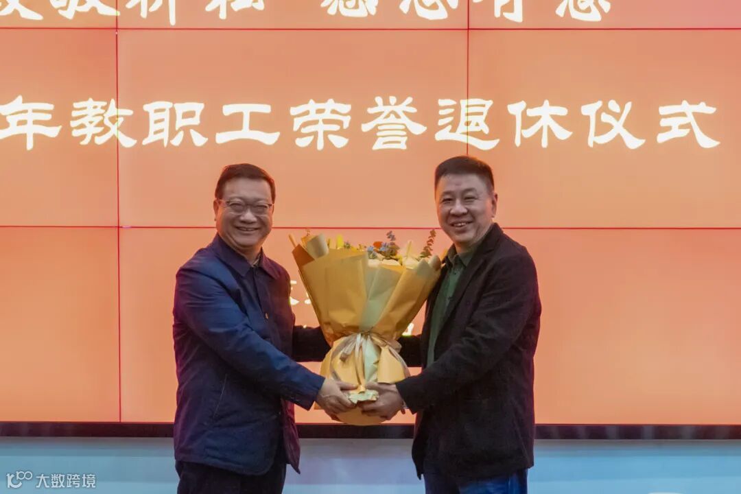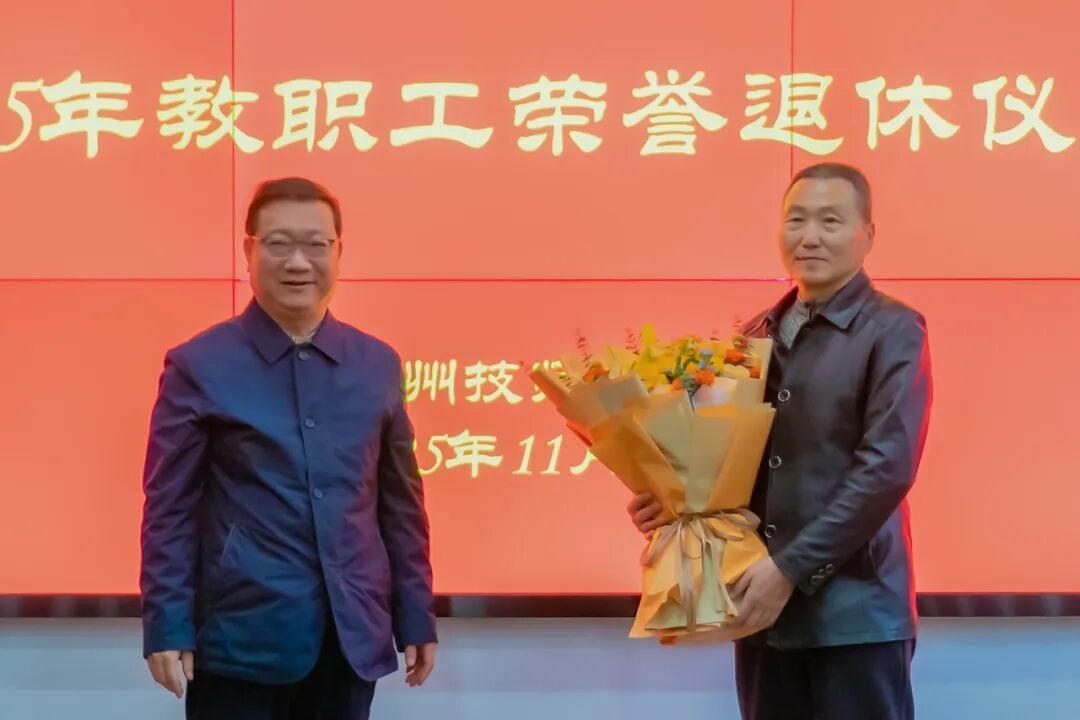 院长徐锡志依次为退休的基础教育部教师席存良、管理工程系教师王建民、电气工程系教师杨杰、现代制造工程系教师陈新飚及原高新校区负责人燕伟献上鲜花。这一束束鲜花,承载着学院对大家数十年默默奉献的深切感谢,更饱含着对他们开启人生新篇章的美好祝福。