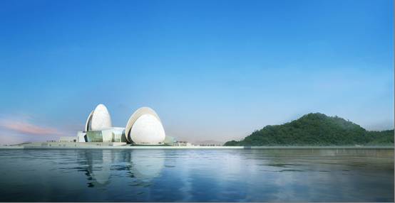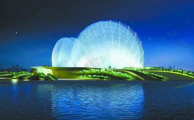 珠海海上歌劇院日月貝的選址在野狸島,是中國第一座建在海島上的劇院。總建築面積59000平方米。工程投資估算約10.8億元人民幣。一大一小兩組“貝殼”的形體,白天呈現半通透效果,一到夜晚則像月光一樣晶瑩剔透。