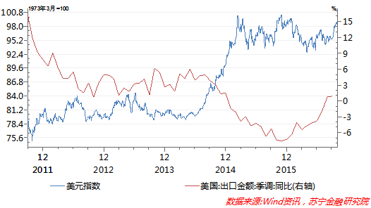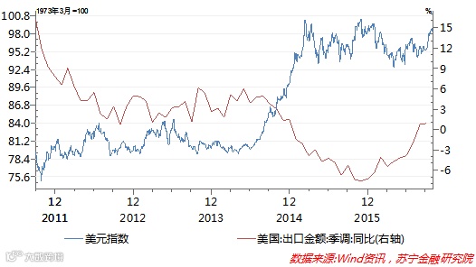 2014年下半年以來,美元指數從80上升到98,升值幅度超過20%。美元大幅升值對美國出口已經形成較大的衝擊——自2015年以來,美國連續20個月出口負增長,直至今年8月轉正。而這正是得益於今年上半年美元指數回落5%後對下半年美國出口促進作用的結果。