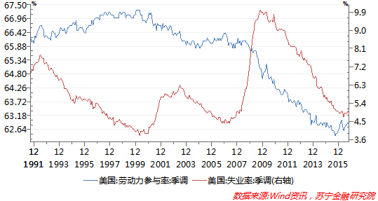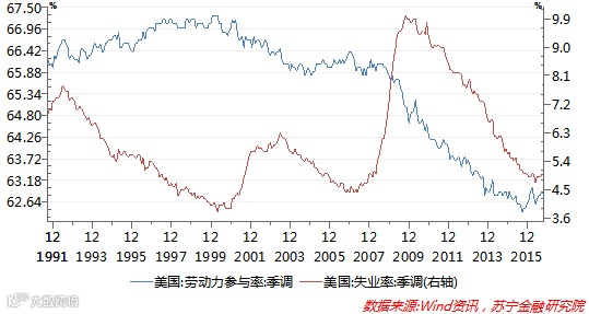 一是2008年以來美國勞動參與率下降了3.4個百分點(參見下圖),這既有美國人口逐漸老齡化的原因,也有大量勞動年齡人口在經過長期失業後喪失工作能力的原因;