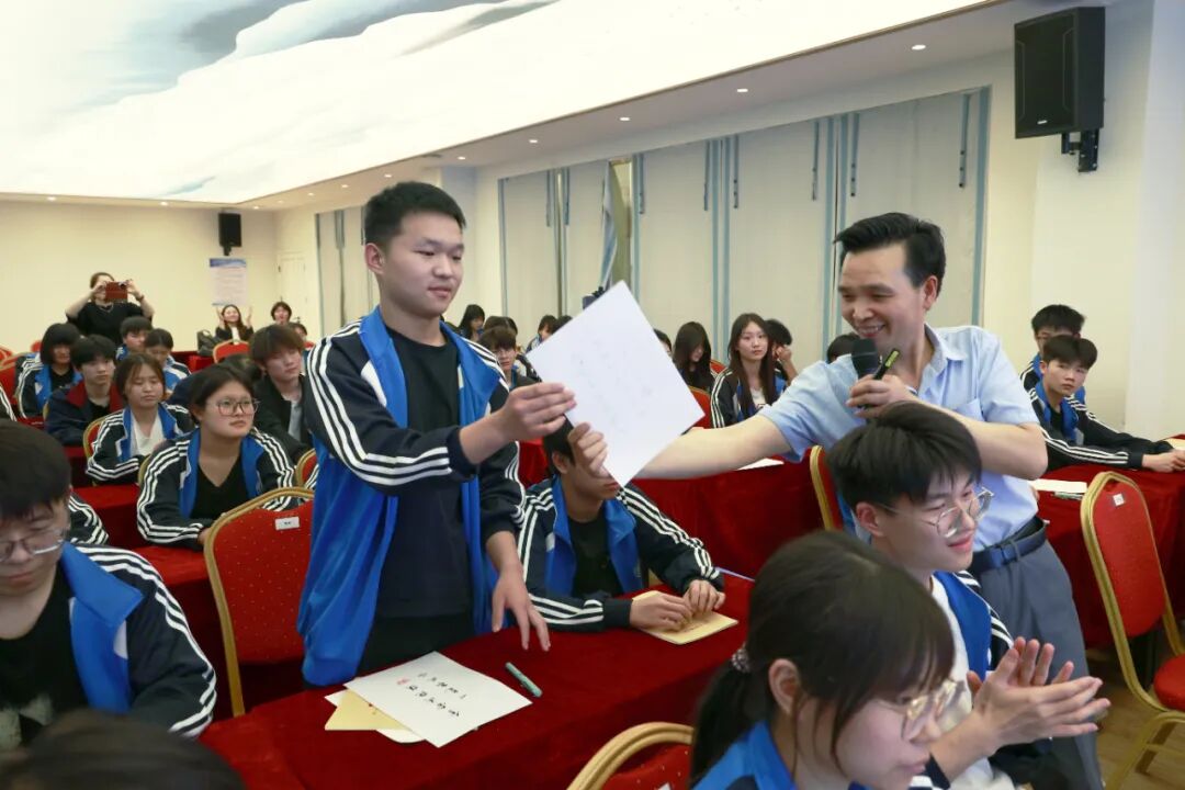 互动环节中,同学们踊跃提问,现场气氛热烈。刘老师精心准备的 “长风破浪会有时,直挂云帆济沧海”“千磨万击还坚劲,任尔东西南北风” 等励志书法作品,作为特别奖励赠予表现优异的学生,激励他们坚定文化自信,勇担时代使命。此次讲座通过线上线下相结合的方式,实现三校区学生同步学习,让文化的魅力惠及更多学子。