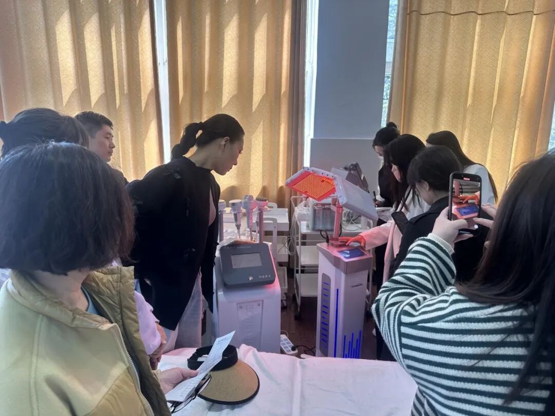 此次培训内容覆盖子嫩肤仪、射频紧肤系统等六大类智能设备的标准化操作规范,采用企业技术专家现场操作示范、专业带头人解析教学要点的"双师协同"培训模式和"理论研习+情境模拟+真人实操"三维实训体系,帮助教师将技术模块转化为可评估的教学单元,有效提升教师设备操作和技术转化能力,为后续课程改革提供可直接应用的数字化教学资源。