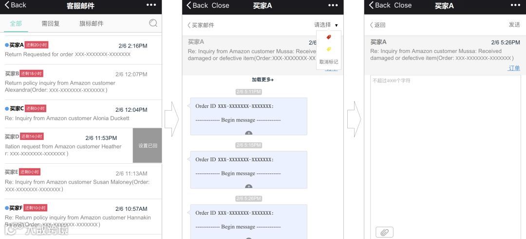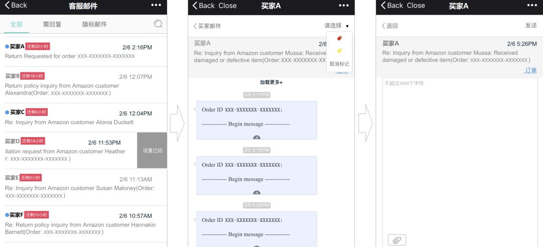 3、“买家邮件”主要以查收-回复为主,你可以将船长的“客服邮件”系统想象成一个三合一的QQ聊天界面,包含买家邮件会话页面、单个买家邮件会话详情、该买家订单(及历史订单)信息: