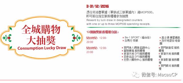 今年的最大亮點是全城所有零售行業共同参与!憑任何消費單據(單張或三張單據內)满MOP500,即可前往指定服務櫃檯參加抽獎噢!