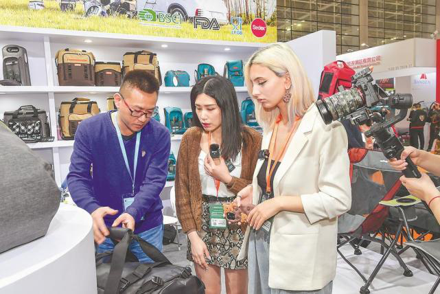 工作人员向外国嘉宾展示户外产品。记者 吴鹏 摄