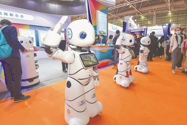 在跨交会上,智能机器人向来宾问好。记者 吴鹏 摄