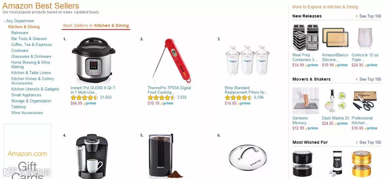 除此之外,我们还可以看到这个页面右侧有“New Releases”和“Movers & Shakers”,美国站还比国内亚马逊还多了“Most Wished For”和“Gift Ideas”,都有TOP100的listing可以参考,特别是对“Movers & Shakers”和“Most Wished For”的相关listing研究,可以预测销售趋势和一段时间内的用户需求。
