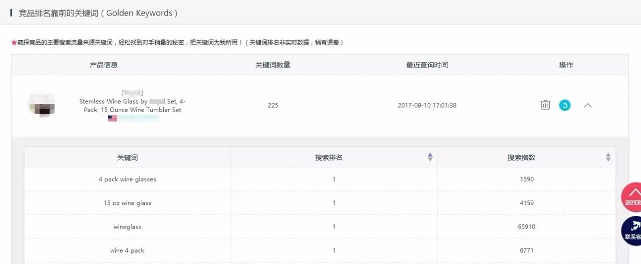 于是我们可以得出结论,“wineglass”作为关键词为这个产品带来的搜索量最高、排名也最靠前;当你考虑做相似产品的关键词时,可以将“wineglass”放入你的Search Term备选词。