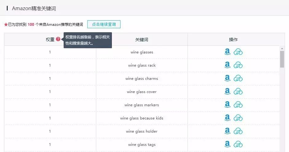 利用亚马逊船长免费的关键词查询工具,可以得到亚马逊推荐的“wineglass”的精准关键词,并按权重排名,越靠前,相关性和搜索量越大。