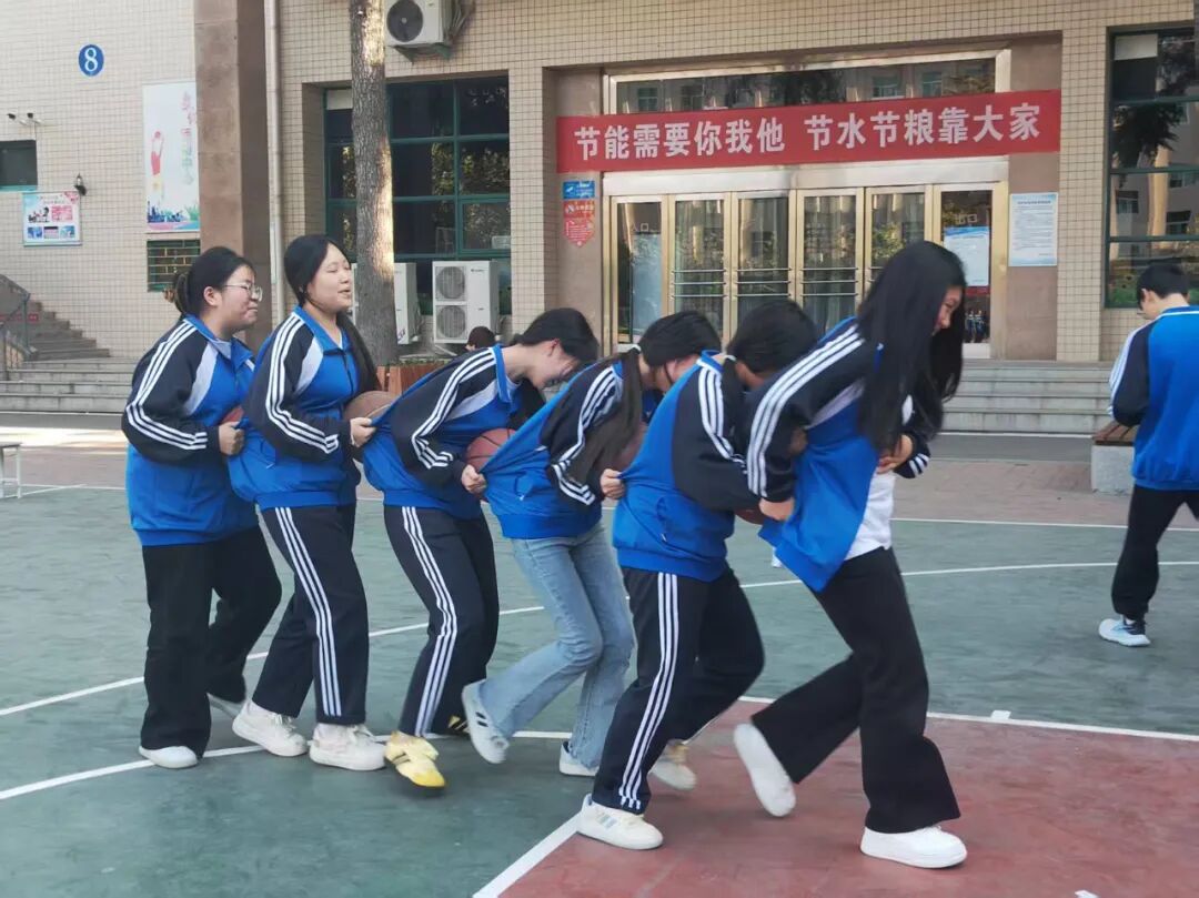 随着响亮的哨声响起,参赛班级立刻呈现出“人体蜈蚣”模式。有的同学以螃蟹般的步伐构建 “防滑系统”,有的则通过小碎步高频震动来实现“精准控球”,甚至有班级摸索出 “S 型走位”巧妙绕过锥桶。参赛选手们后背紧紧相抵,犹如坚固的“人肉保险杠”,篮球在他们的脊背间不断滚动,仿佛在欢快“蹦迪”,这有趣的场景引得围观同学笑声此起彼伏。