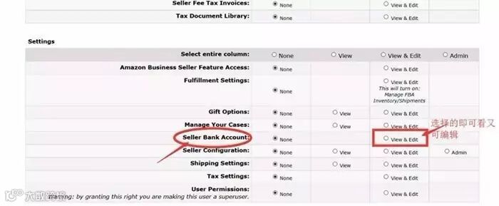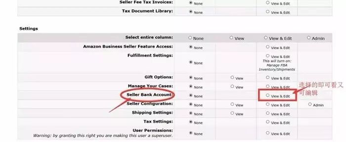 ③成功设置子账号后,需要给子账号赋权(如:seller bank account等关键信息)。 以下页面为子账号权限设置页面,大致分为:没有该权限、尽可查看该项、即可查看又可编辑该项。