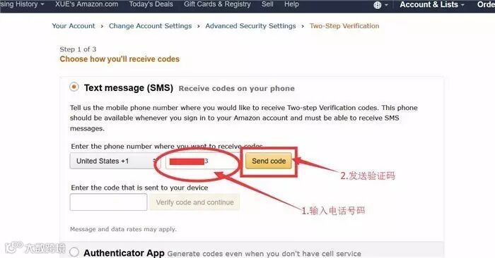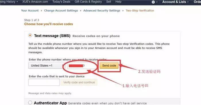⑥按提示输入收到的密码并点击点击 Verify code and continue;接着需要绑定第二支备用电话,可以选择以简讯(Text message)或是语音(Voice call)的方式验证。此后,卖家登录需要两步验证,分别为密码验证和短信验证码验证。