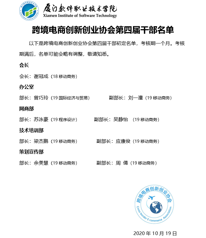 此次换届选举大会有欧阳老师、协会第三届干部和其他同学在场观看。参选的人员共8位,他们是来自2019级移动商务、国际经济与贸易和软件工程专业的同学。