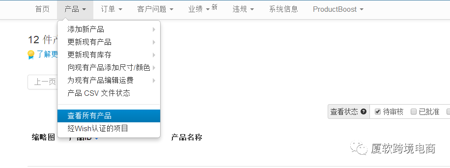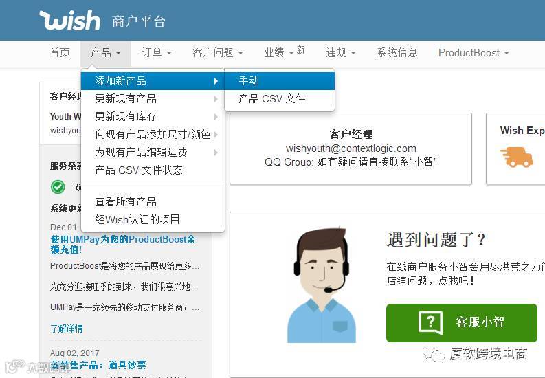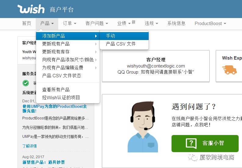 ①手动上传:首先应进入wish商户平台登陆个人(公司)的店铺,然后点击下方图片中产品→添加新产品→手动,进入添加产品的页面;