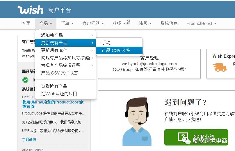 ④CSV文件更新:登陆商户平台,依照下图点击产品→更新现有产品→产品CSV文件
