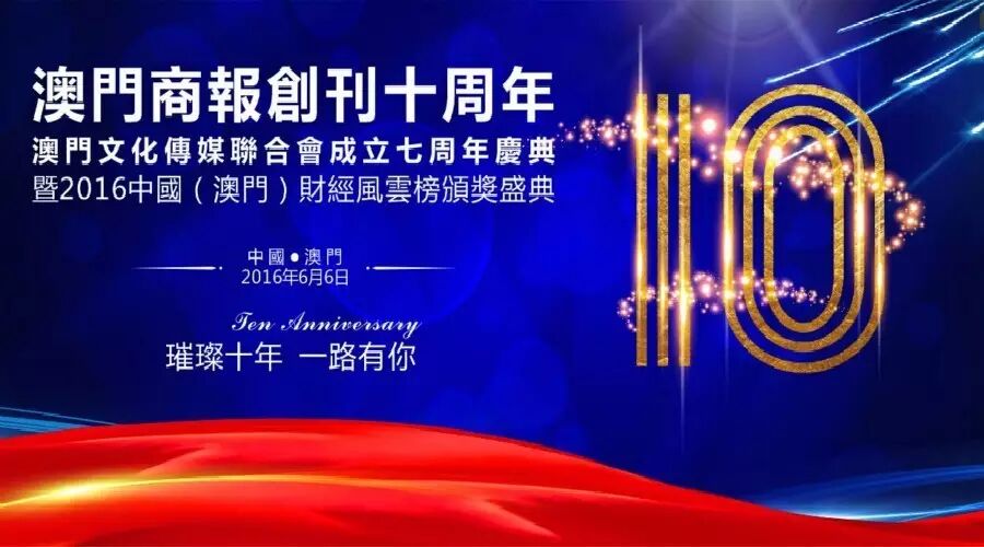 由澳門商報、澳門文化傳媒聯合會、中國(澳門)綜合發展研究中心主辦,雅居樂地產總冠名,《中華英才》海外版、亞洲品牌協會、廣西壯族自治區貴港市人民政府、廣東省清遠市人民政府新聞辦公室聯合主辦的『澳門商報創刊十周年、澳門文化傳媒聯合會成立七周年暨“2016中國(澳門)經貿合作推介會”、“中國(澳門)財經風雲榜頒獎盛典”』 ,於2016年6月6日在澳門喜來登金沙城中心酒店舉行。全國政協副主席何厚鏵,社會文化司司長譚俊榮,中聯辦副主任孫達、文教部長徐婷,外交公署副特派員潘雲東,貿促局主席張祖榮,新聞局長陳致平,旅遊局長文綺華等出席活動。