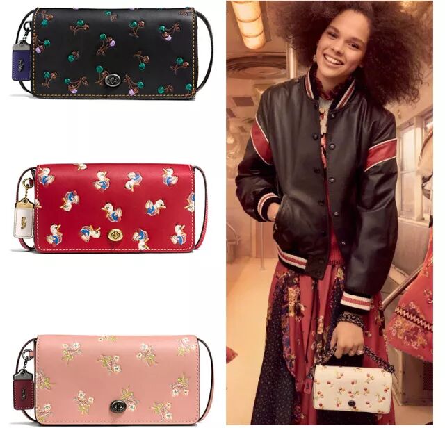 为了防止被撞包,这次Coach可是做足了了功夫,推出了大量的图案,特别是樱桃款,目前有2个颜色,黑色款和白色款,上面的小樱桃采用的都是金色刺绣,即显眼又可爱。除此之外,还有小汽车、鸟、小白花等等图案。