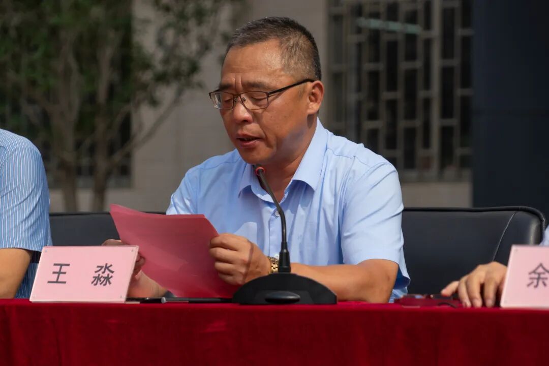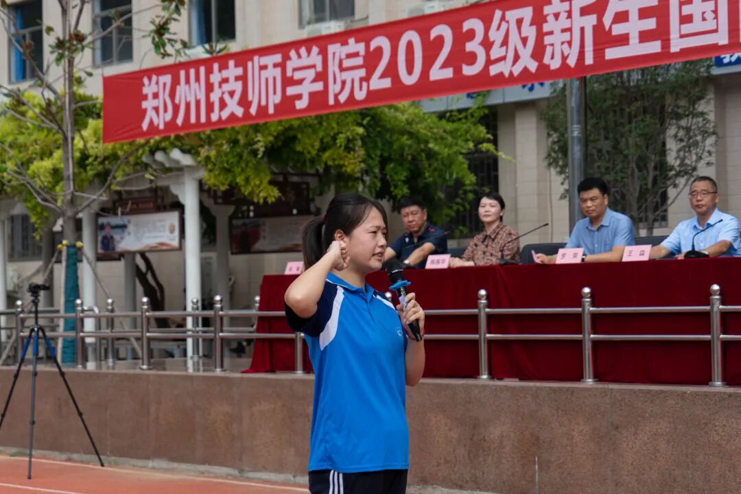 面对国旗、校旗,学生代表王圣娜带领全体学生举起右手庄严宣誓:秉承校风、学风,坚持德以立身、技以立业,认真学习,刻苦训练,努力成为对国家和社会有用的高技能人才。