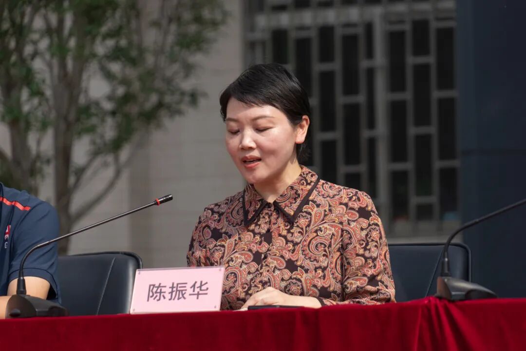 纪委书记陈振华作总结讲话。她代表学院向承担培训任务的全体教官和班主任表示衷心的感谢。对全体新生服从管理、刻苦训练所产生的巨大变化表示肯定。她希望同学们以军训为起点,把军训的精神延续下去,,心怀“星辰大海”,树立“鸿鹄之志”,不畏困难、勇往直前、不懈奋斗,用行动展示青春正能量、引领文明新风尚,努力成为道德高尚、技能高超、追求卓越、勇于创新的高技能人才。