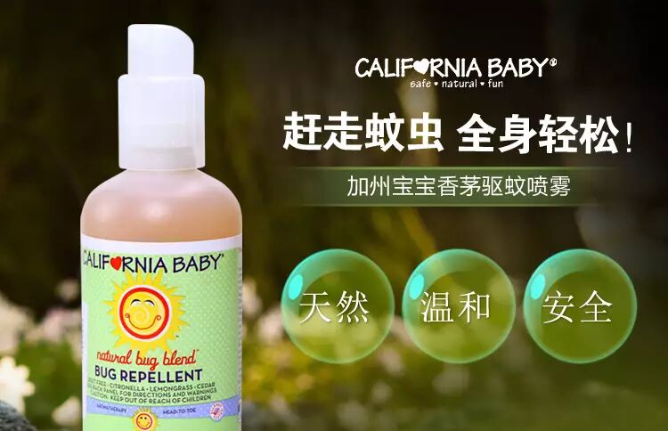 这款蕴含香茅、柠檬香草、雪松精油、芦荟的加州宝宝天然防蚊驱蚊喷雾,其纯植物的草本配方,所有产品成分都是天然有机的,性质相当温和,不含DEET(避蚊胺),安全无毒。
