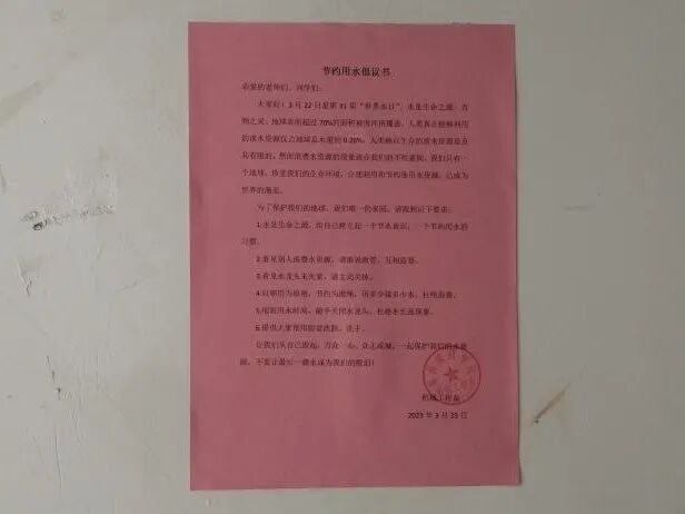 活动采取张贴宣读节水倡议书、组织师生倡议条幅上签字、召开主题班会学习讨论等形式展开,号召全体师生深刻理解水的价值,树立正确的水资源价值观,从现在做起,从小事做起,树立节水意识、养成节水习惯、弘扬节水风尚,关爱水资源、珍惜水资源、保护水资源,争当节约用水的宣传者、文明用水的倡导者、科学用水的践行者。