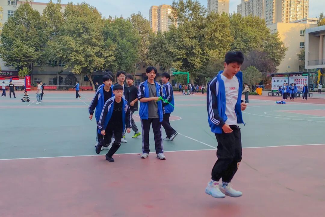 比赛当天,各班参赛同学们在操场上排着长长队伍,摩拳擦掌,摆好阵势。一声哨响,四组参赛班级同时开始比赛。参赛队员沿着“8”字路线依次进入,敏捷的身姿,跃动的彩绳,和着周围拉拉队员的叫好声,安静的校园顿时沸腾起来。