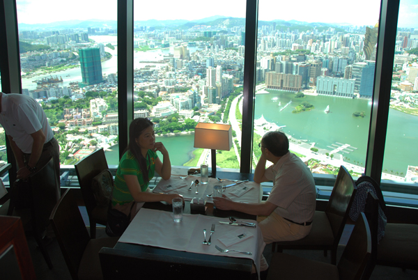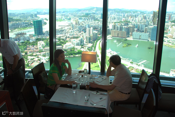 澳門旅遊觀光塔高338米,名列亞洲第八全球第十,比巴黎的埃菲爾鐵塔還要高,360度自助餐在觀光塔的第60樓。360°旋轉餐廳慢慢的順時針轉動著,我們可以一邊品嘗新鮮美食,一面欣賞澳門的美麗風景。