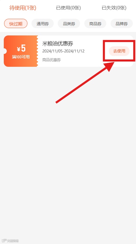 领取优惠券后点击左上角“优惠券”即可查看已领取的优惠券,点击优惠券右侧“去使用”即可跳转到可用优惠券的商品列表。