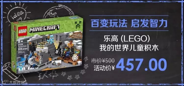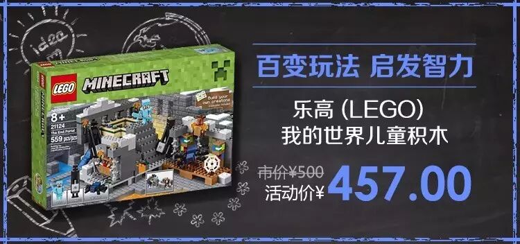 早期最好的玩具——乐高积木。拼插类型的玩具除了锻炼宝宝的动手能力,还能开发智力,乐高作为全球知名的积木玩具品牌,依据宝宝各年龄段特点设计了不同系列,适合6~12岁的乐高基础装块数适中,形状造型多样,色彩明亮鲜艳,且全部采用安全无毒的ABS塑胶材质,就算是宝宝用嘴咬或者摔到地上也不怕中毒、掉色或摔坏。开学季活动价457/套,官网价500/套,快来为宝宝挑选吧~