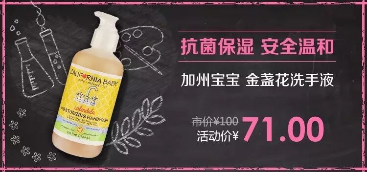 宝宝们天生有探索世界的诉求,经过一天“摸爬滚打”的小手会带着大量细菌,哪种洗手液能在杀灭细菌的同时呵护滋润小手?可以选用加州宝宝金盏花洗手液。金盏花洗手液使用纯天然植物精华液,不会使宝宝受到化学刺激伤害,又蕴含独特清洁护理因子,高效清洁皮肤细菌,并保持小手湿润,一年365天,让宝宝欢快成长!官网价100元/瓶,笨土豆开学季活动特价71元/瓶,速来抢购吧。