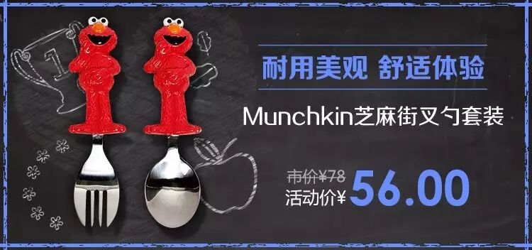 宝宝直接入口的东西最让妈妈操心,材料或质量不好的餐具直接会影响宝宝的健康,麦肯奇的芝麻街宝宝叉勺套装最大的亮点首先是圆角的叉子和勺子让宝宝吃饭更安全,勺子的弧度设计又能保证不会超量让宝宝咽不下,同时还可置于洗碗机清洗让妈妈省了不少力气,顶部的芝麻街木偶卡通造型安全无毒,宝宝在吃饭之余咬咬勺顶也不用担心,就让大鸟和艾莫陪着宝宝吃饭吧~~芝麻街叉勺套装笨土豆活动价56元,官网价78元,如何用餐具让宝宝更爱吃饭,就看它了。