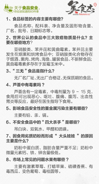 每年,全球約200萬人因食源性和水源性腹瀉病死亡!你知道常見的問題水果有哪些嗎?哪些水產品不宜吃?如何鑒別甲醛水發食品?四季豆為何會致毒?……60個食品安全常識,快來學習一下吧!