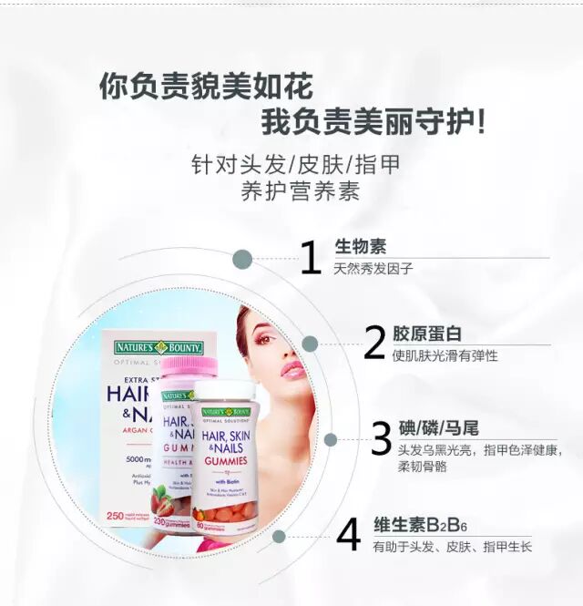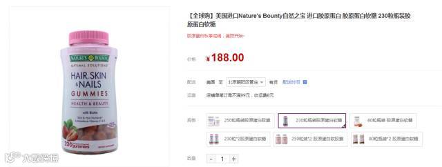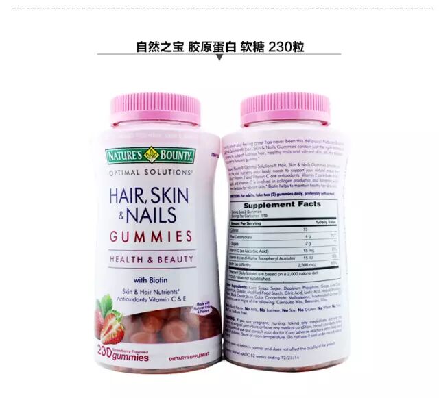 自然之宝,美国知名的膳食补充剂品牌,国内认知度较高。这款自然之宝胶原蛋白片,每3粒含1500mg的胶原蛋白、90mg维生素C、156g钙以及450mg生物素,复合配方帮助恢复肌肤、发质的活力。