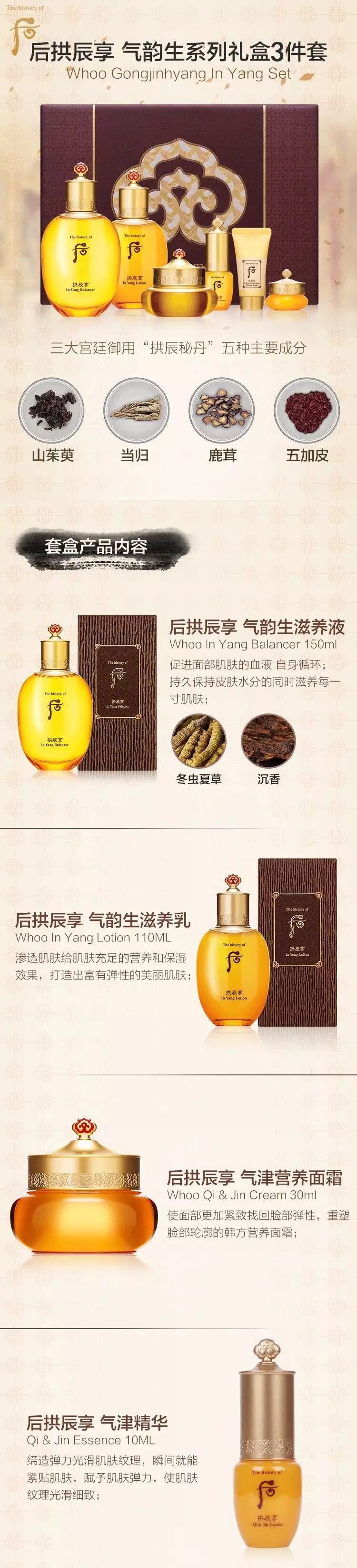 同样是来自韩国的顶级护肤品牌,whoo的分量也是举足轻重,毕竟朴槿惠送给彭麻麻的护肤品你也可以用的到,瞬间自带B格。而且whoo的系列也是化妆品里数一数二的细致,所以选一款适合自己的尤为重要。这个系列主要是针对年轻肌肤设计的,调节水油平衡的功效不错,相当于上次推荐的雪花秀里的滋阴系列了,卖的最好也就不足为奇,作为初试whoo的入门产品还是可以的。至于套盒中的赠品……看命了,你懂的!
