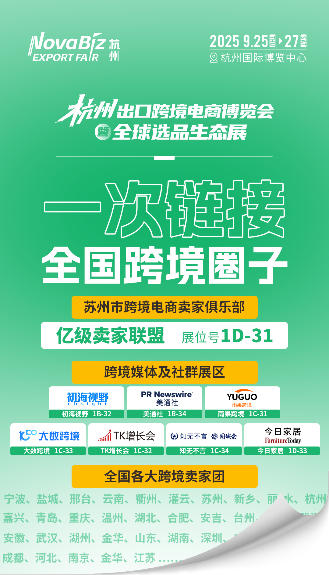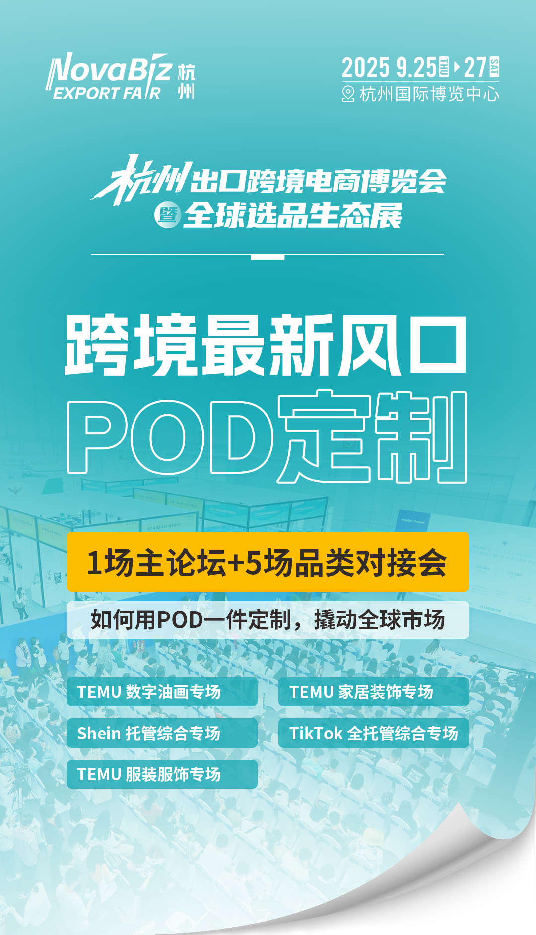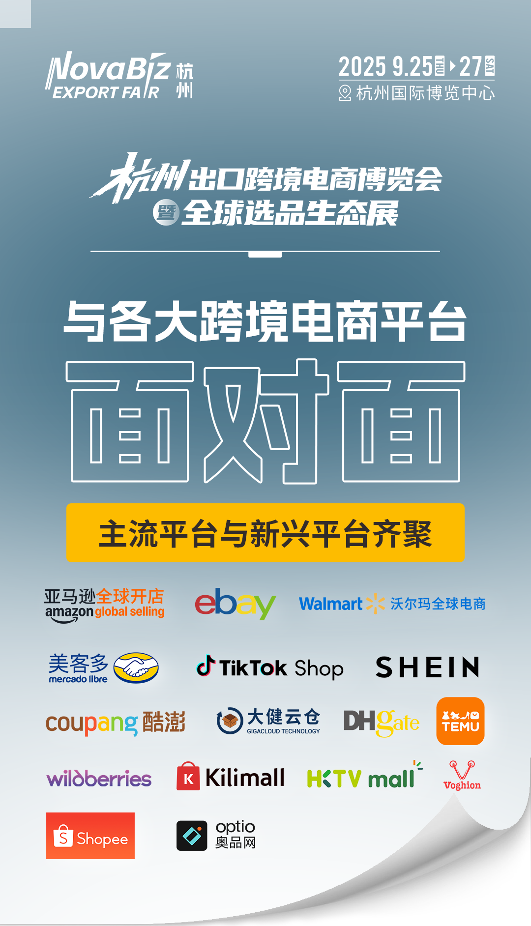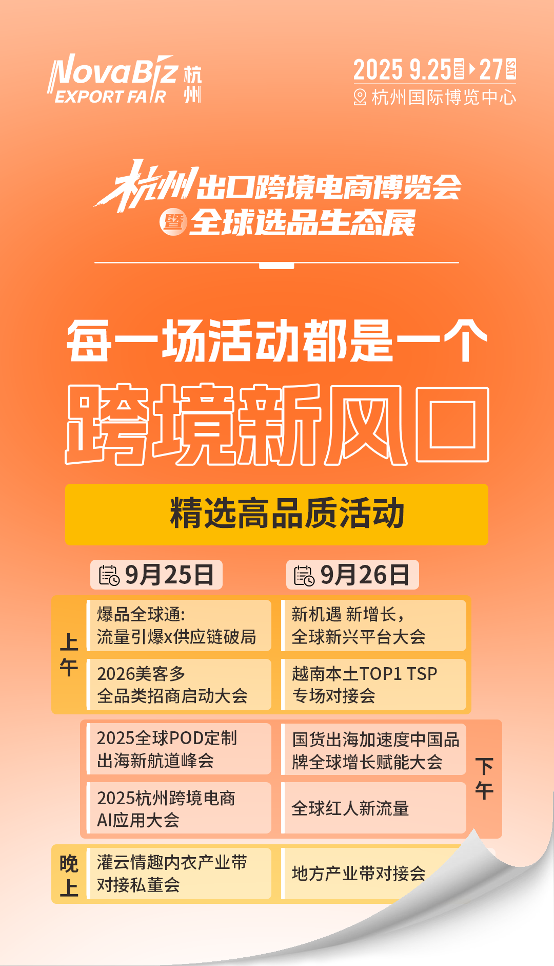 2025 年 9 月 25 - 27 日,2025 杭州出口跨境电商博览会暨全球选品生态展将在杭州国际博览中心举办。展会展览面积超 20000㎡,汇聚 600 + 优质工厂,预计吸引 20000 + 专业观众。以 “1A + 1B” 布局构建展区生态,涵盖跨境家电、物流供应链、选品供应链等板块,特设 “跨境服务生态区”,聚焦 POD 定制、源头产业带、分销、国货出海、全球红人等领域,为行业搭建转型与增量平台,助力企业链接全球资源,探索跨境电商新机遇 。