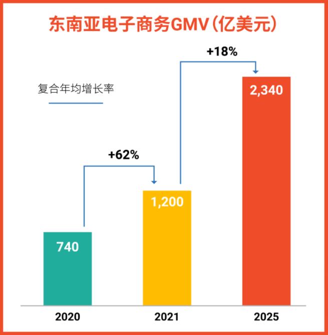 东南亚市场规模2021年预计到达1200亿美元,到2025年有望达到2340亿美元这一数值充分表明出了东南亚市场的电商前景的广阔。
