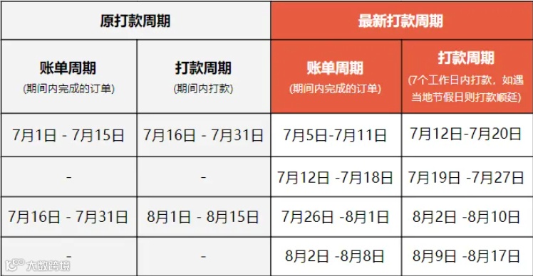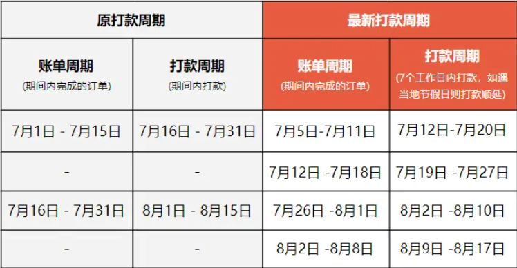 ② 账单周期为6月16日至7月4日完成的订单,将统一在7月5日至13日(7 个工作日)的打款周期打款。