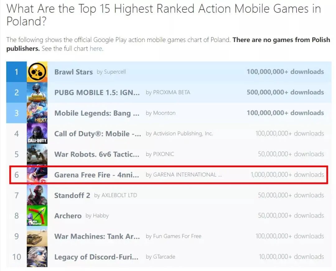 根据应用分析公司42matters的数据,Garena's Free Fire在波兰排名第6。