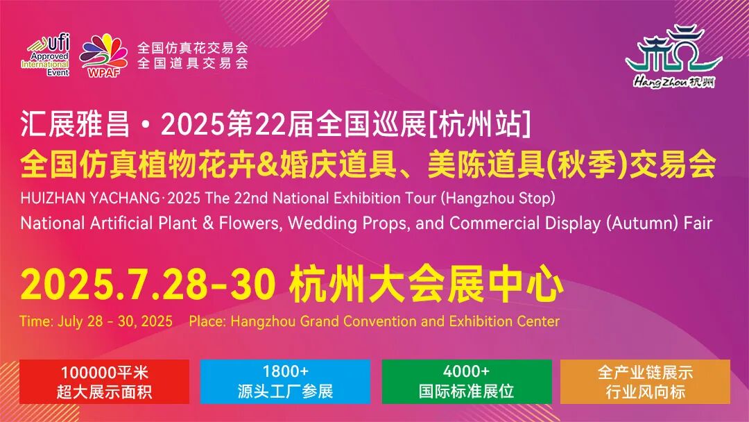 “汇展雅昌·2025第22届全国仿真植物花卉、婚庆道具&美陈道具(秋季)交易会(以下使用简称“汇展雅昌·WPAF秋交会”)”将于2025年7月28-30日在杭州大会展中心隆重召开。