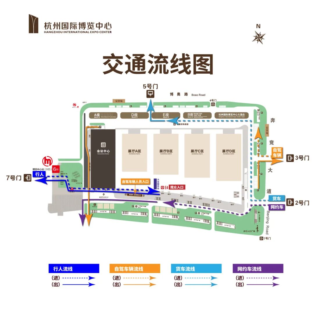 飞机路线:地铁 7 号线萧山国际机场站到奥体中心站,下车后转地铁 6 号线到博览中心站(D 口)下车前往杭州国际博览中心 E4 入口。