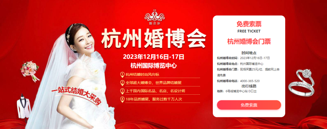 2023杭州婚博会将于12月16-17日在杭州国际博览中心盛大开幕!杭州婚博会是集婚纱摄影、喜宴酒店、婚嫁首饰、婚纱礼服、婚礼服务、结婚百货、蜜月旅游、家居家装等所有婚嫁行业于一体的一站式采购平台,覆盖全国主要城市80%以上的结婚消费人群,能为筹婚新人提供: