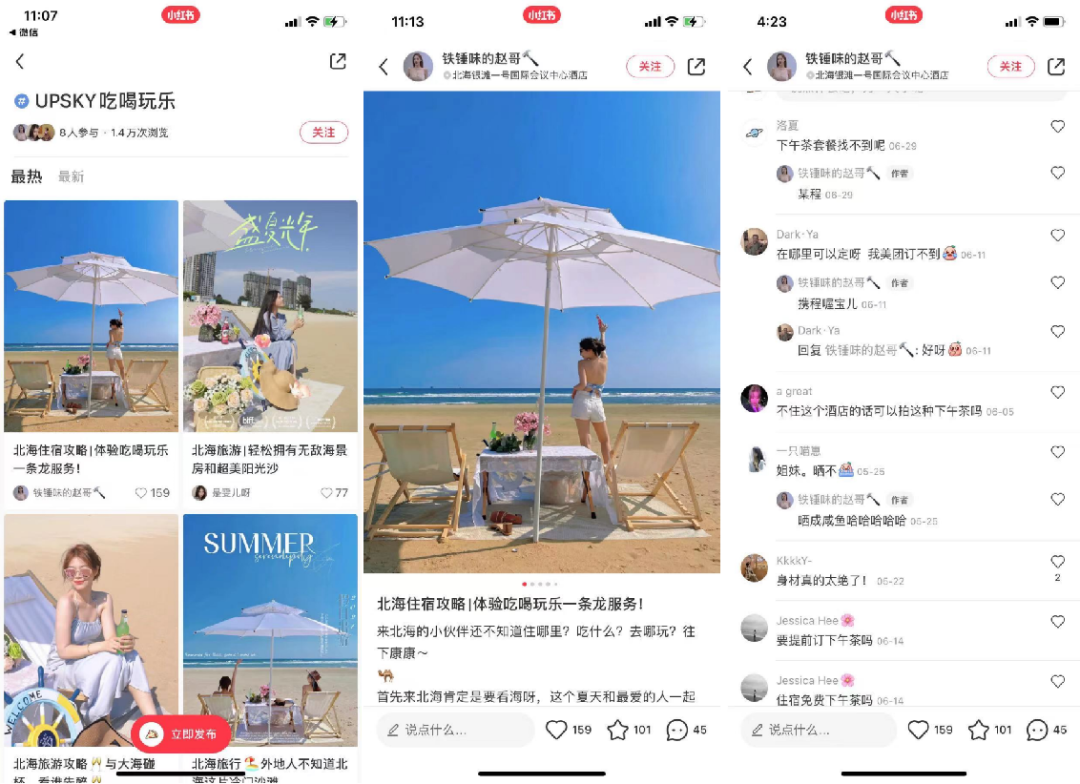 除了抖音、视频号等平台,我们还在小红书上创建话题“#UPSKY吃喝玩乐”,以普凯的客户视角发掘酒店的美,通过垂直博主与粉丝间的黏性,帮助品牌在消费者心中建立信任感。