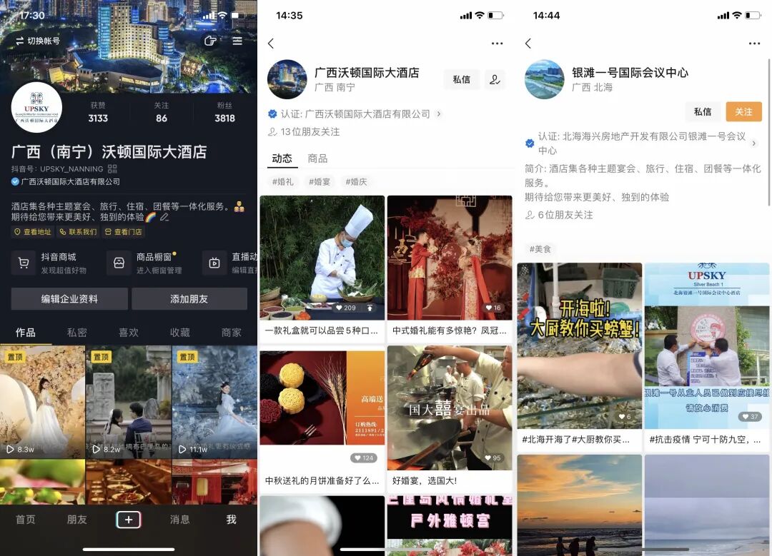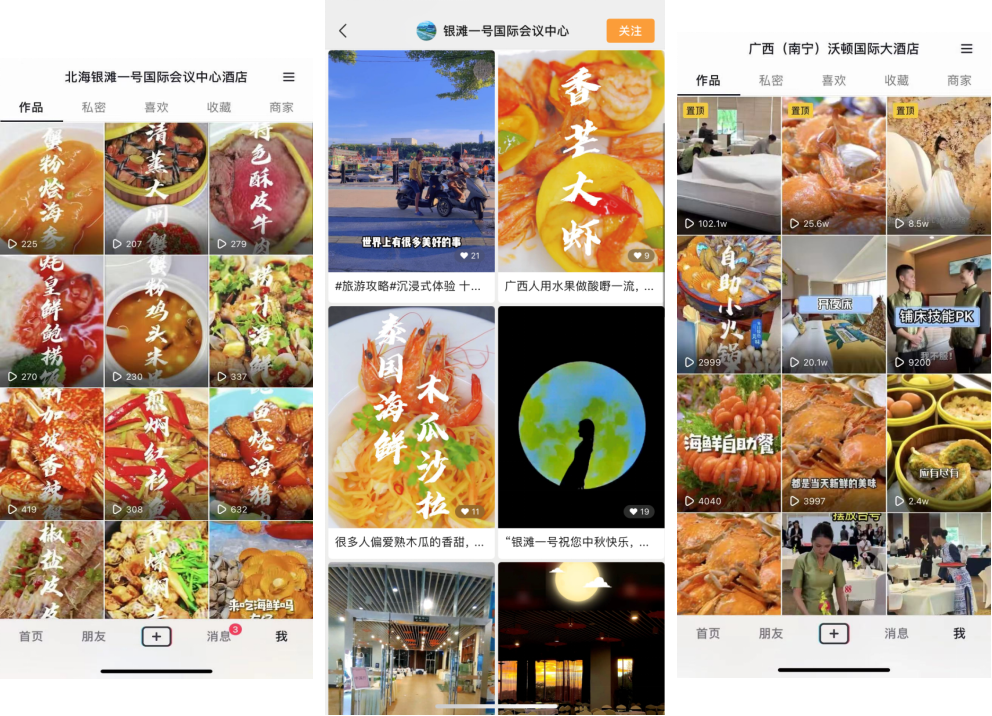 在短短一周时间里,普凯旗下酒店广西沃顿国际大酒店、北海银滩国际一号酒店已经成功搭建含抖音蓝V号、视频号、小红书等新媒体矩阵账号,拓宽了酒店的宣传平台。