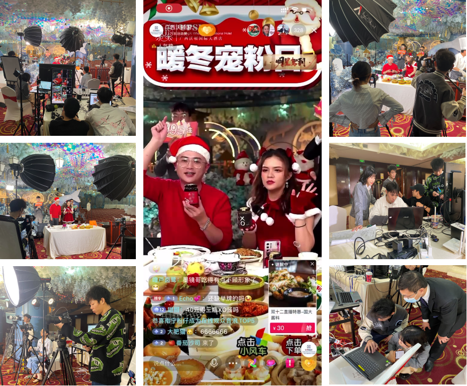 双十二期间,一场历时三小时的直播活动在酒店宴会厅进行,我们的主播首次带领酒店的一名员工快速进入的状态,摄影、导播、运营、客服,大家玩的不亦乐乎。