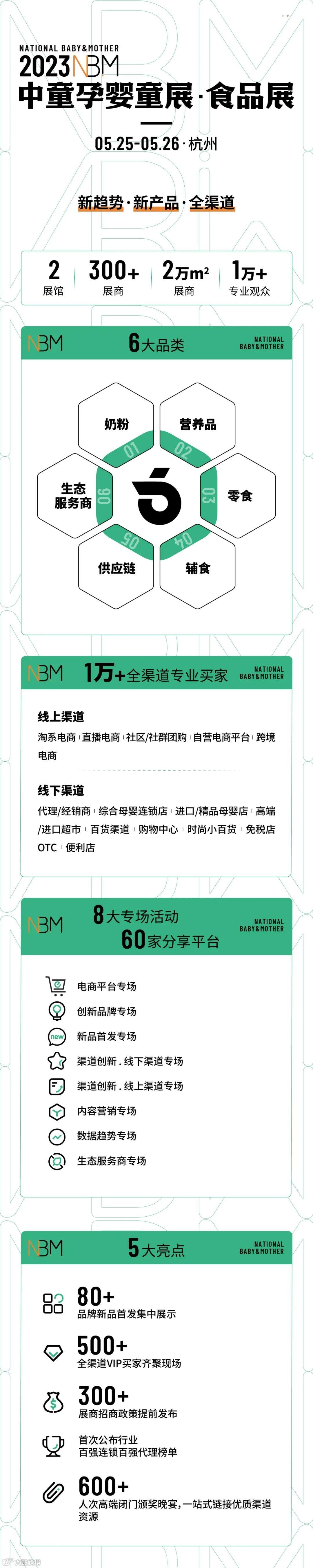 NBM中童孕婴童展·食品展,定位为细分行业的专业展会,只聚焦于母婴食品板块——奶粉、营养品、零辅食等。因此,到现场的买家都是对母婴食品有着高度的兴趣,甚至大部分人都是主力经营母婴食品板块。这将极大的提升双方的契合度,做到第一层级的高效,减少沟通成本。因为从母婴行业来讲,奶粉的买家,可能会对营养品以及零辅食感兴趣,反之亦然。